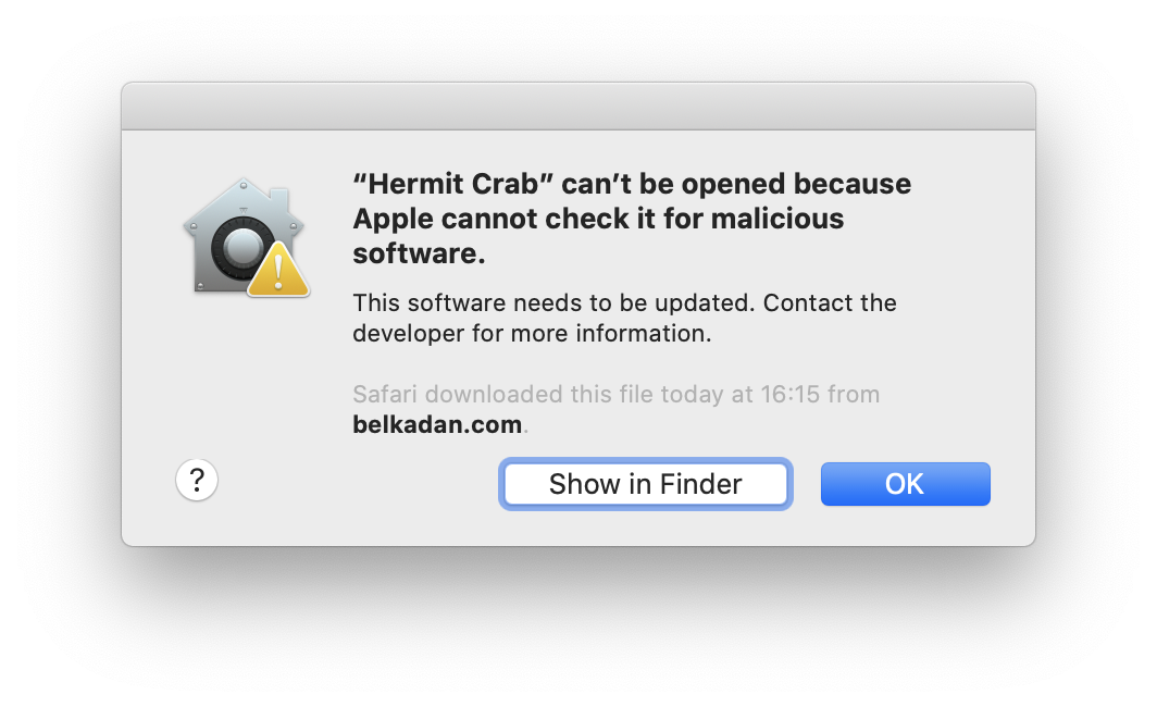 Hermit Crab was released without notarization from Apple, leading to a scary dialog when it’s downloaded and opened for the first time.